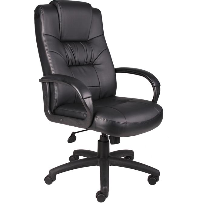 Executive High-Back Chair is upholstered with LeatherPlus, a combination of leather and polyurethane, to promote exquisite softness and durability. Padded, fixed-loop arms are ergonomically designed for extreme comfort through extended use. Pneumatic gas lift allows easy seat-height adjustments to help you find the personalized sitting style that suits you and your work environment. Spring-tilt mechanism allows you to change the angle of the entire seat relative to the floor and to transfer some of your upper body weight to the backrest of the chair. The 27" nylon base offers extra stability to the chair by spreading the load over a larger surface area to help prevent tipping. Hooded, double-wheel casters slide smoothly on floors to make it easy to move and shift directions. It also includes integrated lumbar support, upright locking position, adjustable tilt tension control and more. Executive chair supports up to 275 lb.