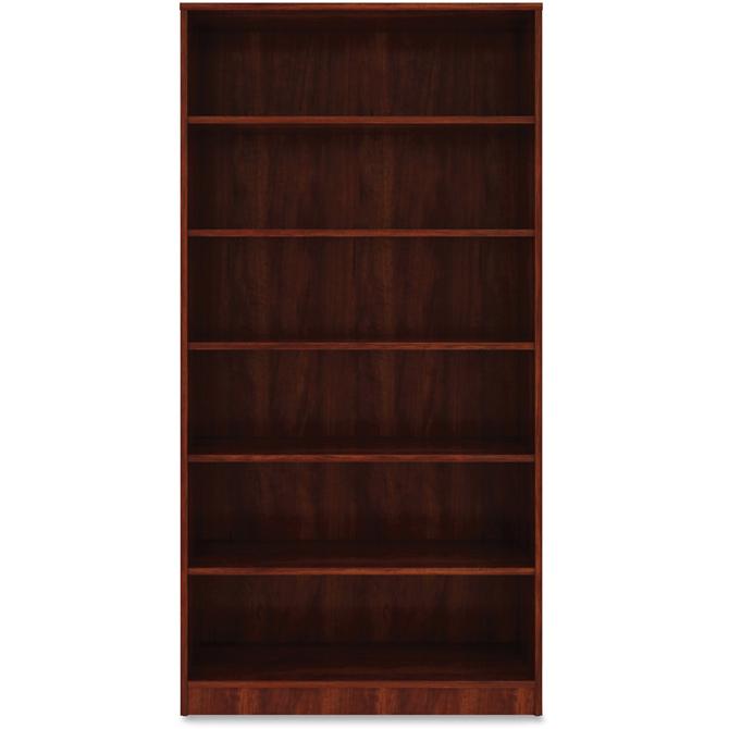 Sturdy, six-shelf bookcase offers high-quality laminate construction and a contemporary design. Shelves are 3/4" thick and made of 18mm thick, medium-density fiberboard with thermally fused, Cherry laminate for long-lasting use. The visible, one-piece backing behind the shelves is made with 3mm thick, medium-density fiberboard and matching laminate. Both sides are finished. Bookcase features five adjustable shelves, one fixed bottom shelf, square edges and adjustable feet. Each shelf holds up to 75 lb.