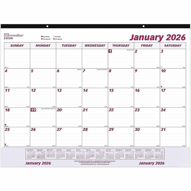 Monthly desk pad offers ample planning space to organize your entire month and look ahead for future planning. Clear vinyl strip at bottom protects the sheets from bending. Use the two holes at the top binding to hang this large calendar on your wall. Tear-off monthly sheets are bound and perforated for clean removal. Dated planning pages range 12 months from January to December. One-month-per-page format includes ruled daily blocks, Sunday-through-Saturday scheduling, count of days/days remaining, holidays, moon phases and a yearly calendar along the bottom. Nonrefillable pad also features a reinforced chipboard backer to protect your desk surface.
