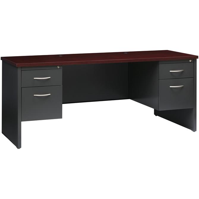 Double-pedestal credenza is part of the Lorell Commercial Steel Desk Series with commercial-quality performance and components. Durable steel chassis supports a 1-1/8" thick, laminated top. Laminate is stain-resistant and scratch-resistant for durability. This 72" wide, double-pedestal credenza with adjustable leveling glides can be used freestanding or paired with a stack-on hutch and other elements for executive workstation. Each locking pedestal includes one box drawer for small supplies and one file drawer. File drawers with premium arch-pull handles accept hanging file folders. Steel ball-bearing suspension makes drawers easy to operate quietly. Built-in cord management with two grommets in the top and two more grommets on the end panels provides easy access to power and data while minimizing clutter. The rich mahogany laminate and charcoal paint create an upscale look and feel for any application. Superior steel construction withstands heavy activity and relocation.