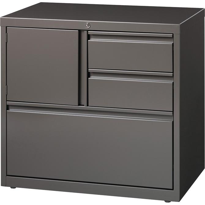 Lateral file offers versatile storage options with a personal storage compartment, two box drawers and a file drawer. File drawer includes hanging file rails for side-to-side filing in letter-size, legal-size or A4-size. Storage compartment includes a grommet for cable management. All three drawers and compartment lock with a core-removable lock with dual locking bars. Drawers also feature full-width pulls and ball-bearing slide suspension. Use the included magnetic label holders for easy identification of drawer contents. Interlock system prohibits opening more than one drawer at a time. Counterweight prevents tipping. Steel construction has a baked enamel finish for durability. Lateral file also offers a reinforced base and four adjustable leveling glides to stabilize it on uneven surfaces. Lateral file meets or exceeds ANSI-BIFMA standards