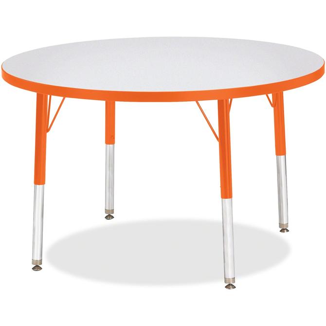 Let children safely work on their favorite arts and crafts on this round activity table. Freckled gray laminate is durable and features an easy-to-clean surface. TRUEdge is permanently thermo-fused to the edges to prevent chipping. Extra-safe, dual-screw steel legs allow you to easily adjust the height of the table. Powder-coated, adjustable legs can be repositioned in 1" increments to provide maximum comfort for children. Leg guides reduce squeaks, prevent snags and eliminate rusting.