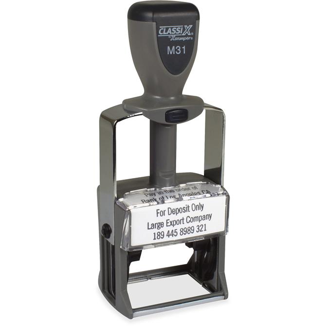 Heavy-duty, self-inking stamp is made from rigid steel and features an integrated, re-inkable stamp pad. Re-inking is simple so you don't have to worry about messy, ink-covered hands. Use ClassiX Refill Ink only to re-ink your stamp pad. Heavy-duty frame and precision components deliver smooth operation and years of use. Custom message stamp is available in red, black, blue, green and purple. Impression size is 1-1/16" x 1-7/8". Comfortable handle makes it easy to use.